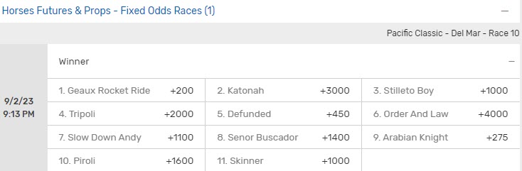 Here are the morning line odds (and post positions) for this years Pacific Classic. The odds will change throughout race day depending on the amount of money that comes in on each horse.