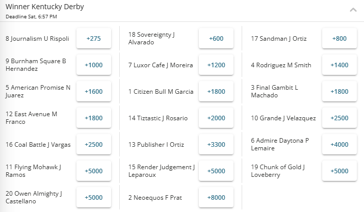 If you’re placing your wagers before race day, you can select ‘Horses Racing’ -> ‘Horses Daily’ -> ‘Kentucky Derby’ in the ‘Sports’ section of the website. Here is a screenshot of the odds in the sportsbook (taken on April 30th):