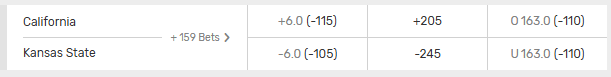 The three most popular betting markets for college basketball games are the point spread, money line (to win), and total. Below I will use a California vs Kansas State game from this season as an example to help explain these three common wagers.