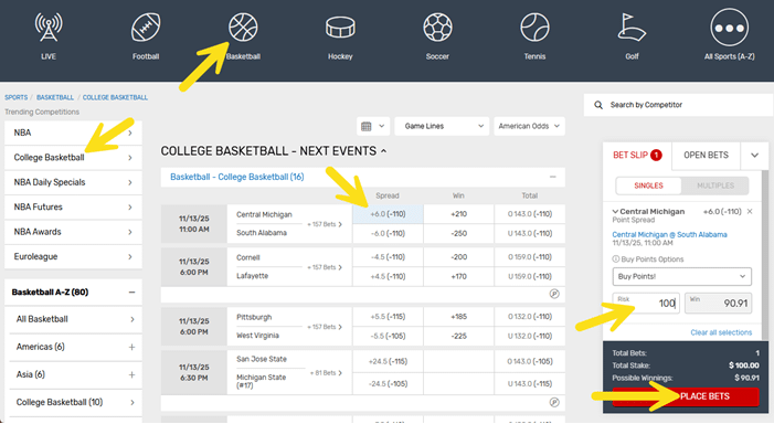 Click ‘Sports’ from the top menu bar and ‘Basketball’ from the secondary sports menu. Then select ‘College Basketball’ from the Trending Competitions or Basketball A-Z menus.