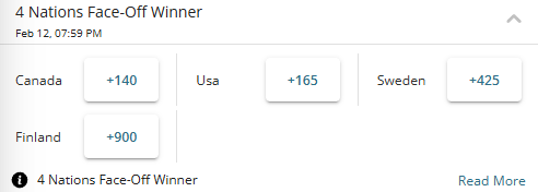 You can also select ‘NHL Futures’ -> ‘4 Nations Face-Off’ to find the tournaments futures betting markets including the tournament winner.
