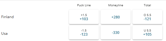 - Moneyline – This is simply a bet on which team will win the game outright. You would have to risk $330 to win $100 betting on Team USA, while a $100 wager would win $280 betting on Finland.