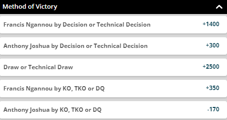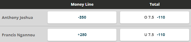 Anthony Joshua is the favorite with odds of -350, while Ngannou is the underdog with odds of +280. The odds could still change as we approach fight night on Friday evening. To see the up to date odds on the BetOnline website open the ‘Boxing’ drop down menu and select ‘Bouts’.