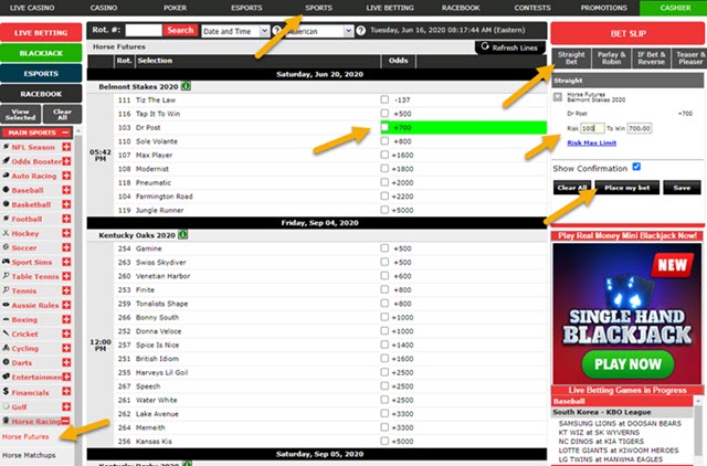 In the Racebook section you have the full variety of horse race betting options. Open the ‘Thoroughbred’ drop down menu and select ‘Saratoga’. Select race #13 (post time of 7:04pm) for the Belmont Stakes.
