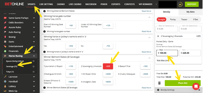 The Belmont Stakes odds will be available down the page past the earlier races. Pick your horse, enter your risk amount on the Bet Slip and click ‘Place Bet’ to lock in your wager.