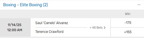 - The Canelo vs Crawford odds will be at the top of the screen under the ‘Elite Boxing’ header.