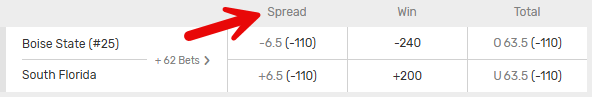 In this example Boise State is a 6.5 point favorite (-6.5). Boise State must win by 7 or more points for a spread bet on Boise State to win. South Florida is a 6.5 point underdog (+6.5), so South Florida must either win the game outright or lose by 6 or fewer points for spread bets on South Florida to win.