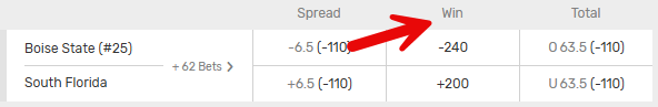 In this example Boise State are -240 favorites. This means a $240 bet on Boise State would win $100 (payout $340). South Florida is a +200 underdog so you would win $200 for every $100 risked if South Florida pulled off the upset.