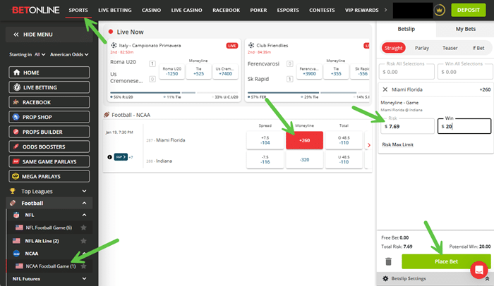 Click on ‘Sports’ from the top menu back, open the ‘Football’ drop down menu and select ‘NCAA’ -> ‘NCAA Football Game’. The Miami vs Indiana game will be at the top of the screen under January 19th at 7:30pm EST.
