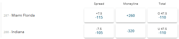 Indiana is a 7.5 point favorite in this game and the money line indicates that Indiana is being given a 76.2% chance of winning this game.