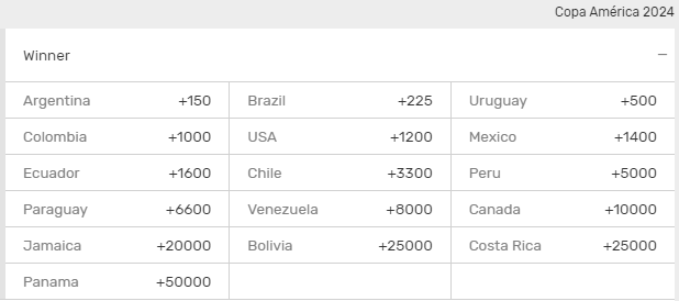 The most popular futures bet on Copa America is betting on which team will win the tournament. Here are the odds for the 2024 Copa America leading into the tournament (odds taken on June 21st – after the Argentina vs Canada opening game of the tournament):