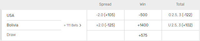 Here is a screenshot from USA’s opening match of the tournament vs Bolivia showing the three most popular bets you can make on a Copa America match: spread, to win, total (screenshot taken June 21st).