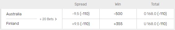 - Spread – In the above example, Australia is a -9.5 point favourite to win the game. Spread bets on Australia would win if they win the game by 10 or more points. Spread bets (+9.5) on Finland would win if they win the game outright or lose by 9 or fewer points.