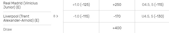 Here’s a screenshot showing the odds for the Vinicius Junior (Real Madrid) vs Trent Alexander-Arnold (Liverpool) match from the round of 16: