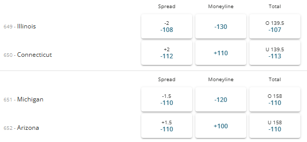 The two remaining #1 seeds will meet in the second Final Four game on Saturday. Michigan is a 1.5 point favorite in the game. Like Illinois, both Michigan and Arizona have won all of their tournament games by double digit scores. Whoever wins this game will be the favorite in the National Championship on Monday night.