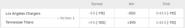 The money line is simply a bet on which team will win the game. The odds for each team represent the risk vs reward of the bet. In the above example the Los Angeles Chargers are a -550 favorite, which means you would have to wager $550 to win $100 betting on LA. The Tennessee Titans are a +390 underdog, so a $100 bet on the Titans would win $390 if they pulled off the upset.