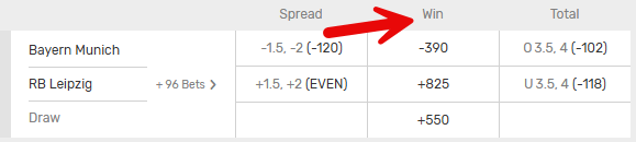 In this example Bayern Munich is a -390 favorite to win the game. This means you would risk $390 to win $100 betting on Bayern Munich to win. A $100 bet on a draw would win $550 (payout $650) and a $100 bet on RB Leipzig would win $825 (payout $925).