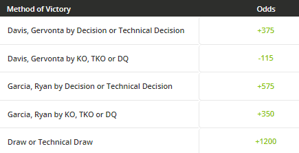 BetOnline.ag also has several other betting lines such as method of victory, round betting and more. You can see the full list of betting lines for the fight by selecting the player names or the ‘+11 Markets’ link. Here’s a look at the method of victory odds (odds from morning of fight):