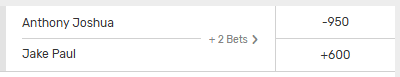 Anthony Joshua is a big favorite in the fight with his odds of -950 implying a probability of 90.5% that Joshua earns the win. Jake Paul is a +600 underdog, which indicates an implied probability of 14.3% that Paul pulls off the upset. The extra 4.8% is the juice in the betting market.