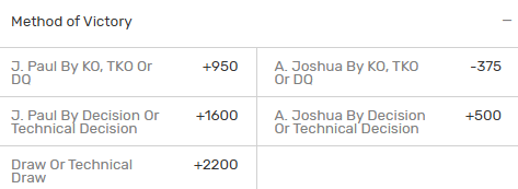 Select ‘Sports’ from the top menu bar on the Bovada website. Select ‘Boxing’ from the secondary All Sports menu. Open the ‘Elite Boxing’ menu to find the Jake Paul vs Anthony Joshua odds. Click the fighters names to see the full list of betting markets for the fight.