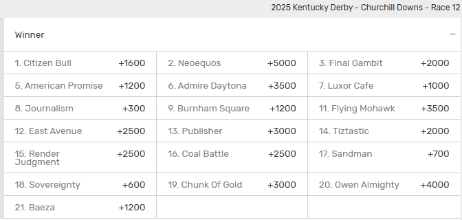 Here are the odds for the race from the ‘Sports’ section of the website (odds from May 2nd – the day before the Derby):