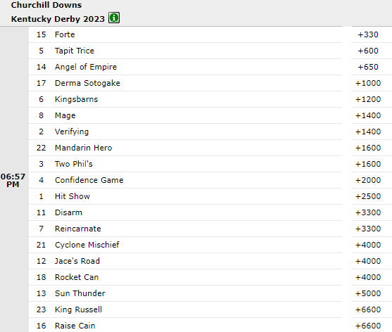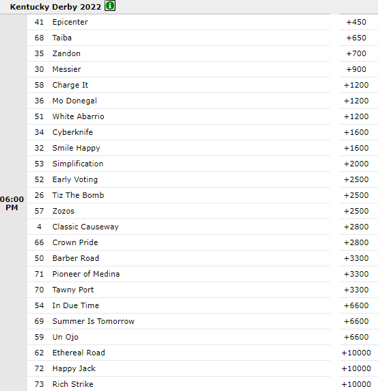 Here are the odds and post positions for the 2025 Kentucky Derby from the Bovada sportsbook (taken on May 3rd – the morning of the Derby).