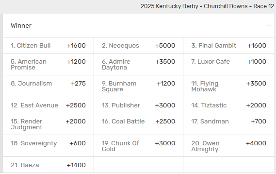 Here are the odds and post positions for the 2025 Kentucky Derby from Bovada sportsbook (odds from May 3rd – the morning of the Derby):