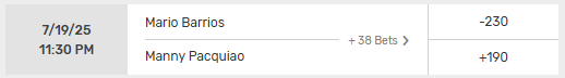 Mario Barrios is a -230 favorite to win the fight. These odds imply a probability of 69.7% that Barrios defends his title. Manny Pacquiao is a +190 underdog, which indicates that Pacquiao has a 34.5% chance of winning the fight. The extra 4.2% is the juice in the betting market.