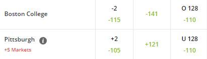 In this above example North Carolina is a 3.5 point favorite in this First Four game against San Diego State.  If you bet UNC to cover the spread they would need to win by 4 or more points for your bet to win.  The middle odds are the money line.  These indicate that a $165 bet on North Carolina would win $100, while a $100 bet on San Diego State would win $145 if they pulled off the upset.  The over/under is set at 142 points for the game.