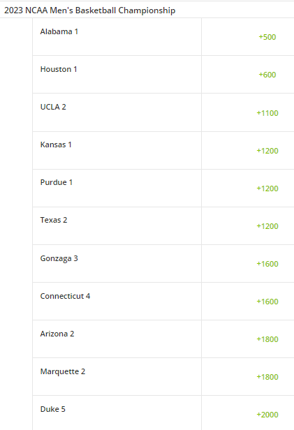 You can also place futures wagers, such as who will win the NCAA tournament.  Here are the odds for the current favorites from BetOnline (taken March 17th, 2025):