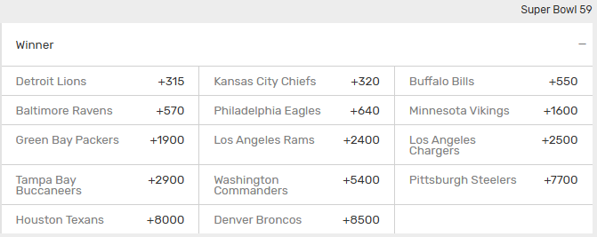 Here are the odds for the Super Bowl winner from Bovada.lv leading into the 2025 NFL Playoffs (odds from January 8th):
