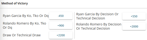Select ‘Sports’ from the top menu bar on the BetOnline website. Open the ‘Boxing’ drop down menu and select ‘Bouts’. Click Ryan Garcia vs Rolando Romero to see the full list of betting markets for the fight.