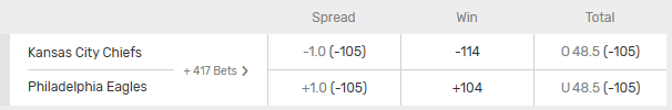 Betting on the winner of the game is also known as money line betting. The odds associated with each team determine your risk and reward. The Chiefs are -114 favorites, so you would have to bet $114 to win $100 betting the Chiefs money line. The Eagles have odds of +104, so risking $100 would win $104 if the Eagles win the game.
