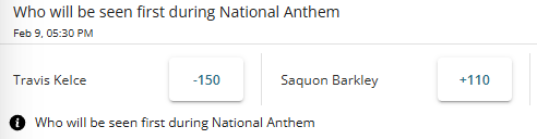 There are several “which person will be shown first” props available for the National Anthem. This one looks at which star offensive player (not including QB’s) will be shown on television first. Travis Kelce of the Chiefs or Saquon Barkley of the Eagles.