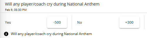 There are a few betting markets related to people crying during the Anthem. This prop asks whether we will see a player or coach crying during the national anthem.