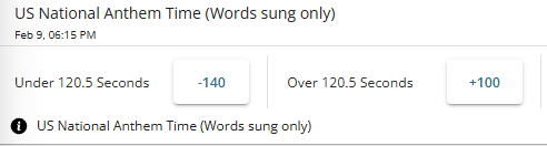 Let’s take a look at some of the National Anthem prop bets you can make at BetOnline.ag. All of the odds below were taken on February 5th. The odds and betting options could change at BetOnline as we approach the Anthem performance.