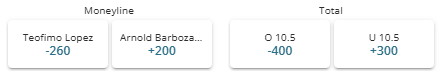 Here are the odds for the Lopez vs Barboza fight from BetOnline.ag (odds taken April 30th):