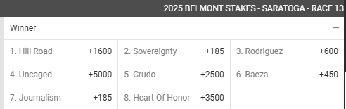 Here are the fixed winner odds and post positions for the 2025 Belmont Stakes. The screenshot below was taken from the Bodog sportsbook on June 6th (the day before the race). You can find the current odds for the race at Bodog.eu by opening the ‘All Sports A-Z’ menu and select ‘Horses Futures & Props’.