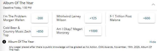 In this example, Morgan Wallen is the favorite to win Album of the Year with his I’m The Problem album. Lainey Wilson is the other top contender with Whirlwind.