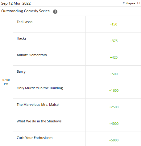 Here is a screenshot of the odds for the Outstanding Comedy Series to give you an idea of what the odds will look like: