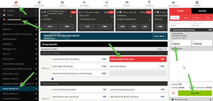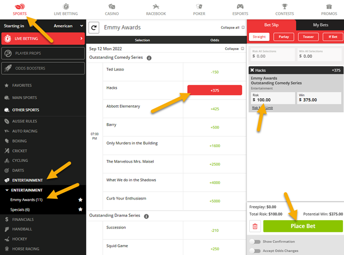 Open the ‘Entertainment’ drop down menu in the Sportsbook section of the site and select ‘Emmy Awards’.