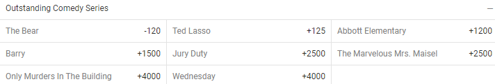 In this example The Bear is the favorite with odds of -120, while Ted Lasso is the second favourite with odds of +125. Abbott Elementary (+1200) and Barry (+1500) are being given an outside shot, while it would be a significant surprise if one of the other nominees won the award. Check out our betting odds page for a further breakdown of how to read the odds for each category.