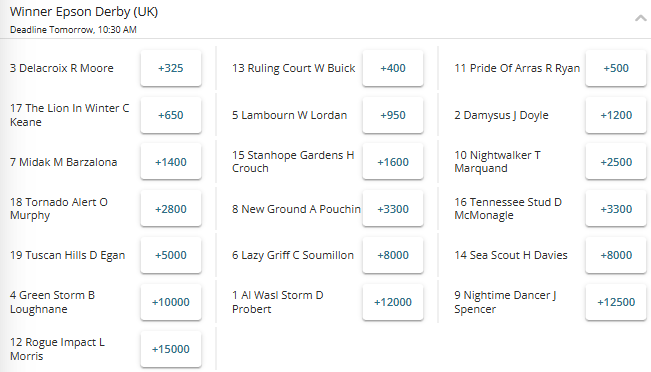 - The Epsom Derby winner betting market should be shown at the top of the page.