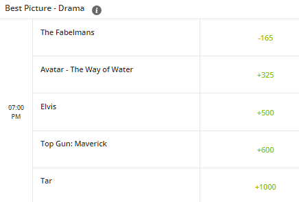 Here is a screenshot of the odds for the Best Picture (Drama) category to show you an example of what the odds will look like (odds taken on December 29th):
