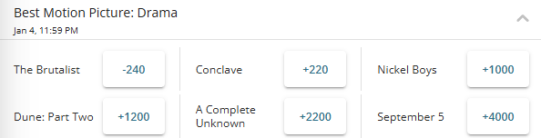 In this category, The Brutalist is the favorite with odds of -240, while Conclave is the other main contender with odds of +220.