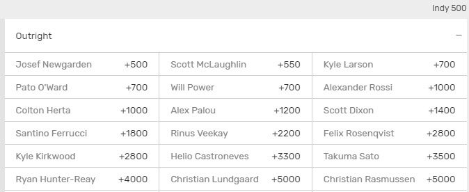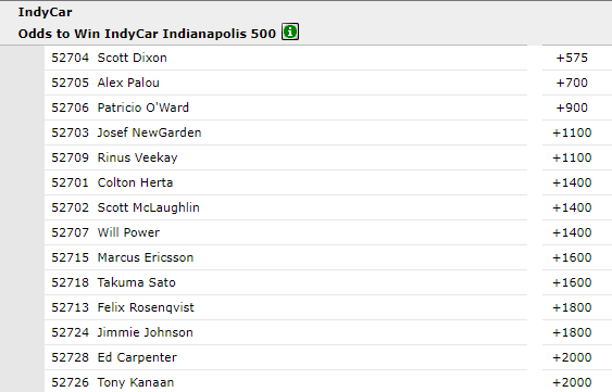 Here are the odds for the Indy 500 winner from BetOnline.ag. These odds were taken on Saturday (the day before the race), so they could still change leading up to the race.