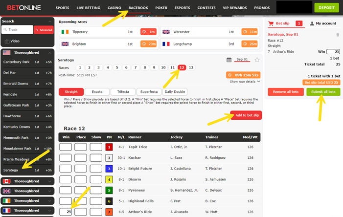 You will need to add the money you want to bet on the race. BetOnline accepts Visa, MasterCard, American Express, Bitcoin, Ethereum, and more depending on your location.