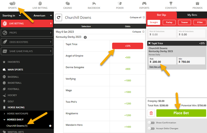 Leading up to race day you can place a futures wager on the 2025 Kentucky Derby winner in the ‘Sports’ section of the website. Click on ‘Sports’ in the top navigation bar and then select ‘Horse Racing’ -> ‘Kentucky Derby’ from the left sidebar to see the Kentucky Derby winner odds.