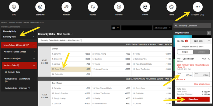 - Select ‘Kentucky Oaks’ under the ‘Trending Competitions’ menu. This will bring up the Kentucky Oaks – Main Markets page. **You can bet on Kentucky Oaks winner, top 2, and top 3 finish in the sportsbook.