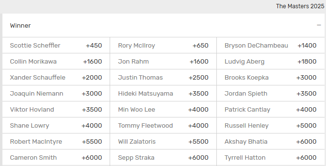 Scottie Scheffler is the significant favorite leading into The Masters, Rory McIlroy is the other favorite. After these two Bryson DeChambeau, Collin Morikawa, Jon Rahm, Ludvig Aberg, and Xander Schauffele are the other top contenders. I included the golfers with 60-1 or shorter odds in the above screenshot.